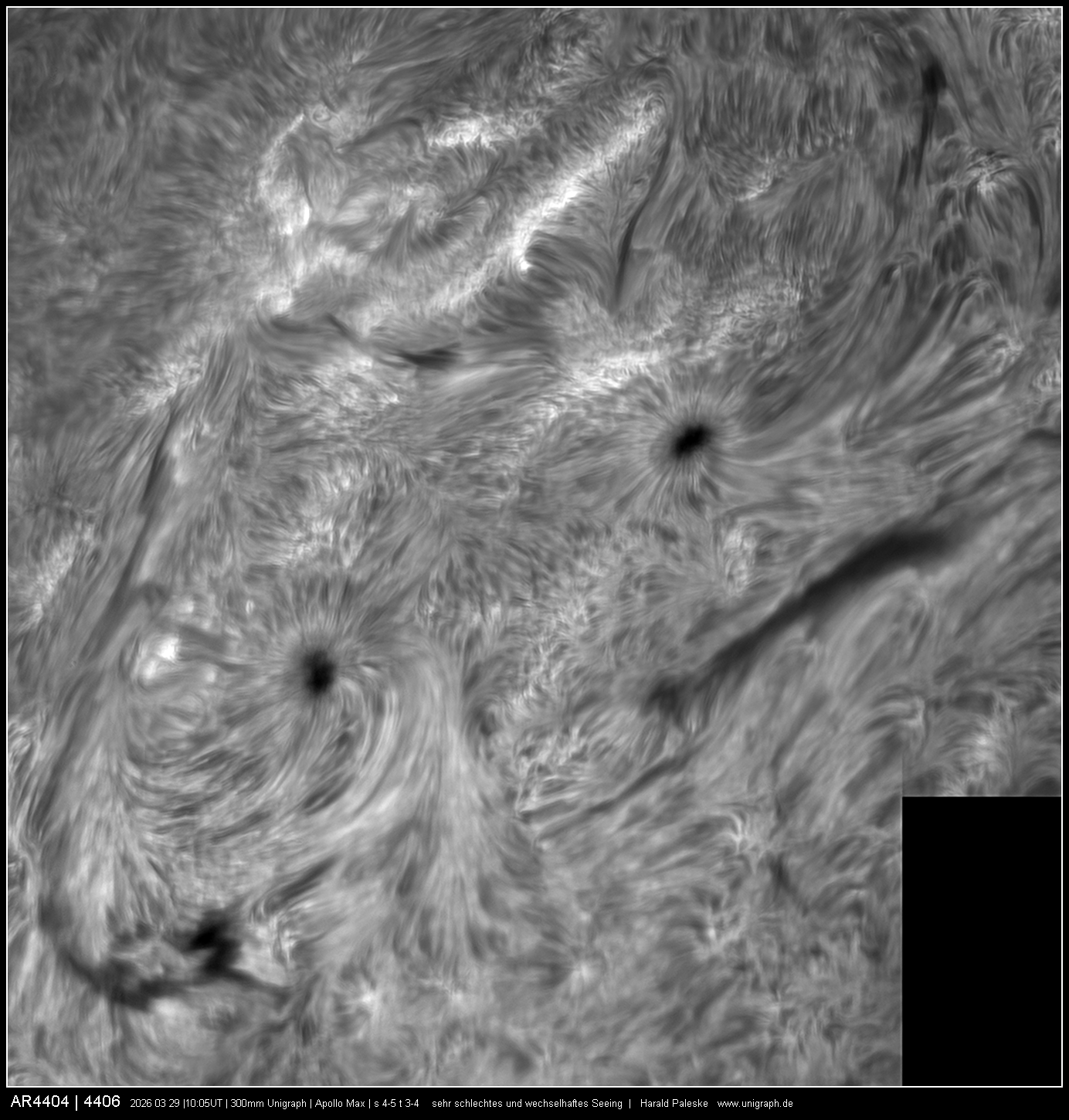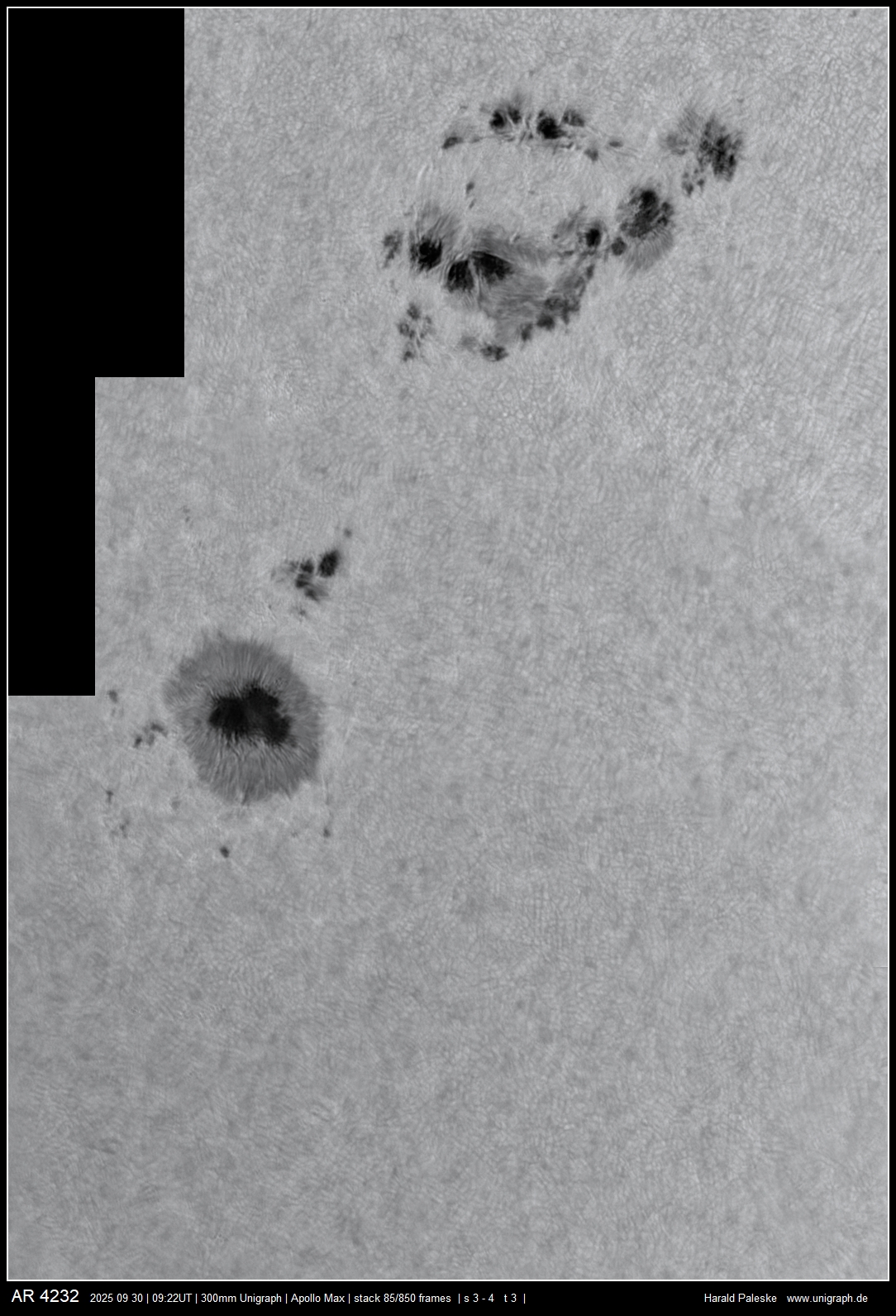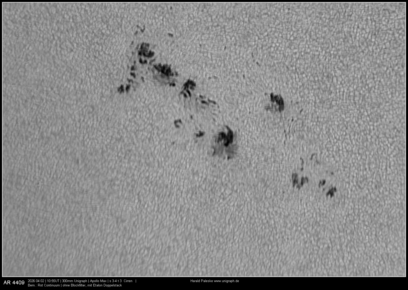 Ich habe mit drei unterschiedlichen Okularen Detailbeobachtungen angefertigt - 12,5mm H; 4mm R und 4mm R mit Hyperionbarlow. Sehr leicht ließen sich bei hohen Vergrößerungen die deutlichen Lichtbrücken in Umbrau und Penumbra ausmachen.