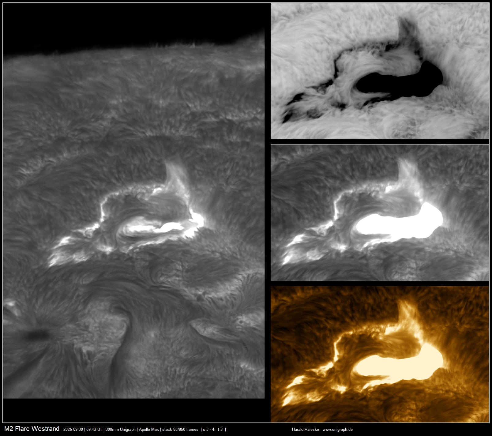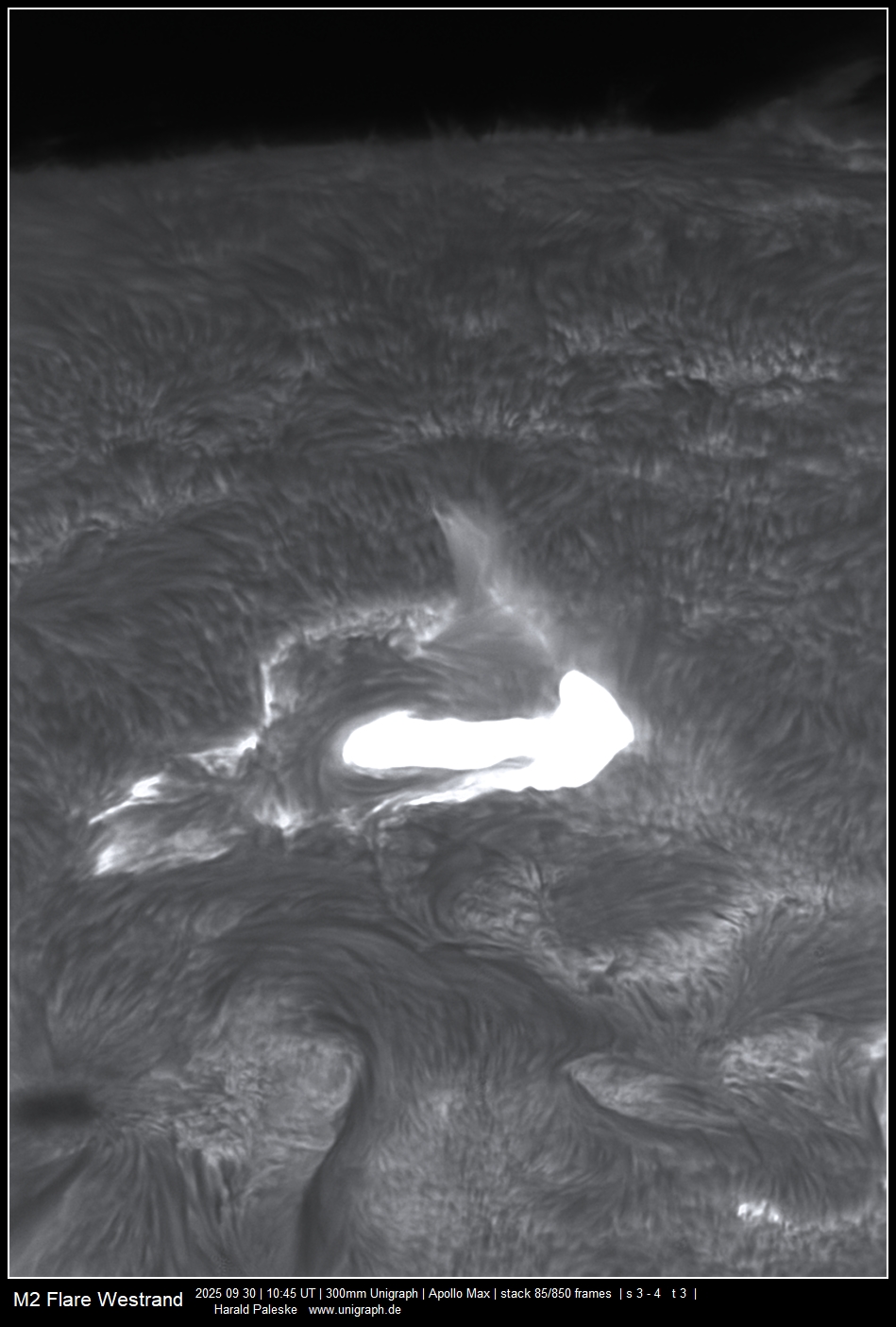 Bild 1 . Heute war der Westrand sehr aktiv. Neben einer aktiven Protuberanz welche in kurzer Zeit abhob folgte ein M2 Flare. Leider konnte der Aufstieg der Protuberanz nicht anfänglich dokumentiert werden. Auch war