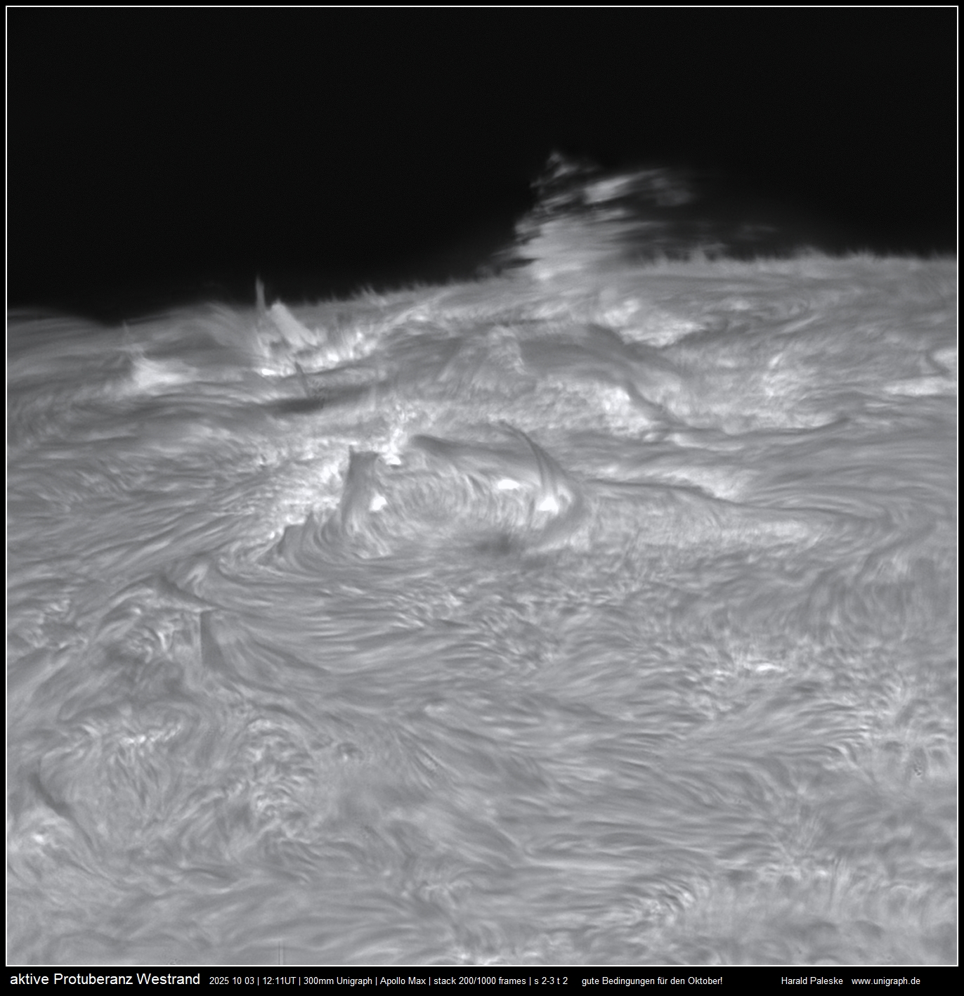update: Neue Bilder der schönen aktiven Protuberanz am Ostrand vom 19.08.2025 in die Ha Gelerie hochgeladen. Hier ein Bildbeispiel