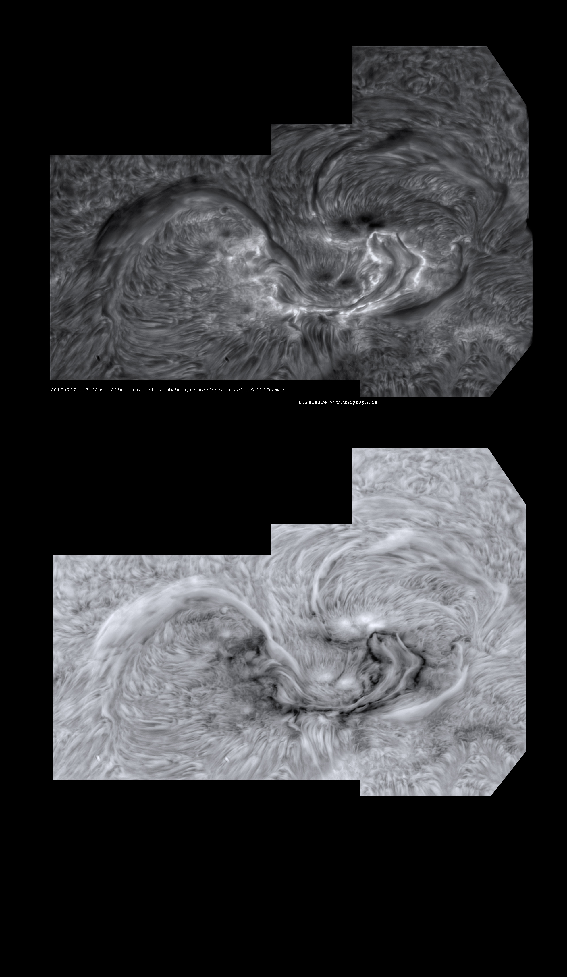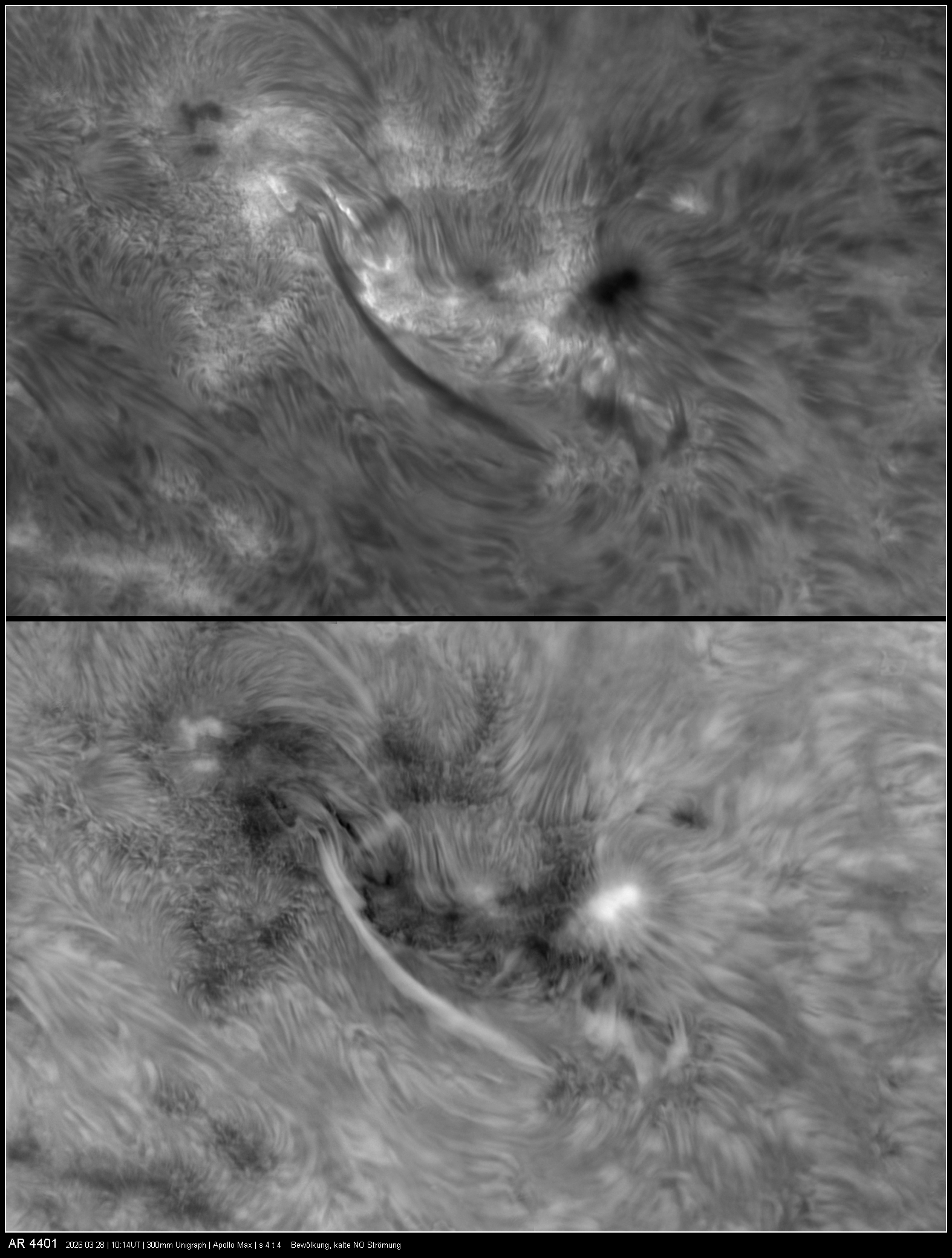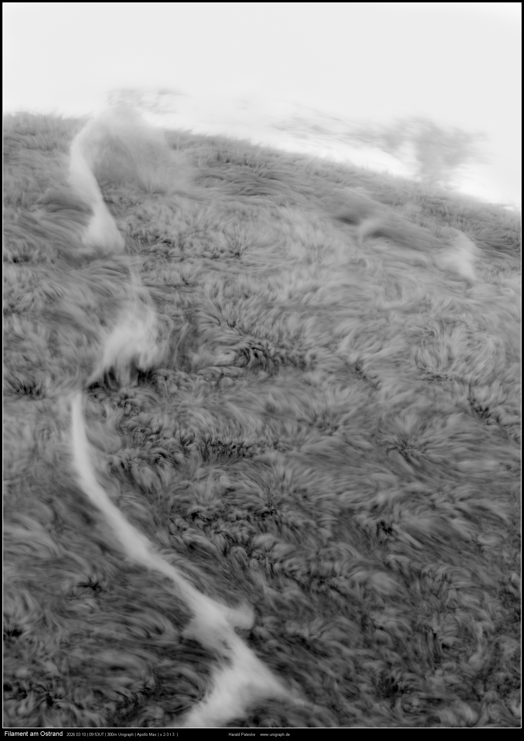 Bild 2 Bild 3 (10:01UT) Trotz starker Veränderungen hob das Objekt im Beobachtungszeitraum nicht ab (was ich insgeheim gehofft hatte). Auf Grund der Dynamik der Erscheinung wurden keine Weißlichtaufnahmen sondern nur das Positionsbild angefertigt.