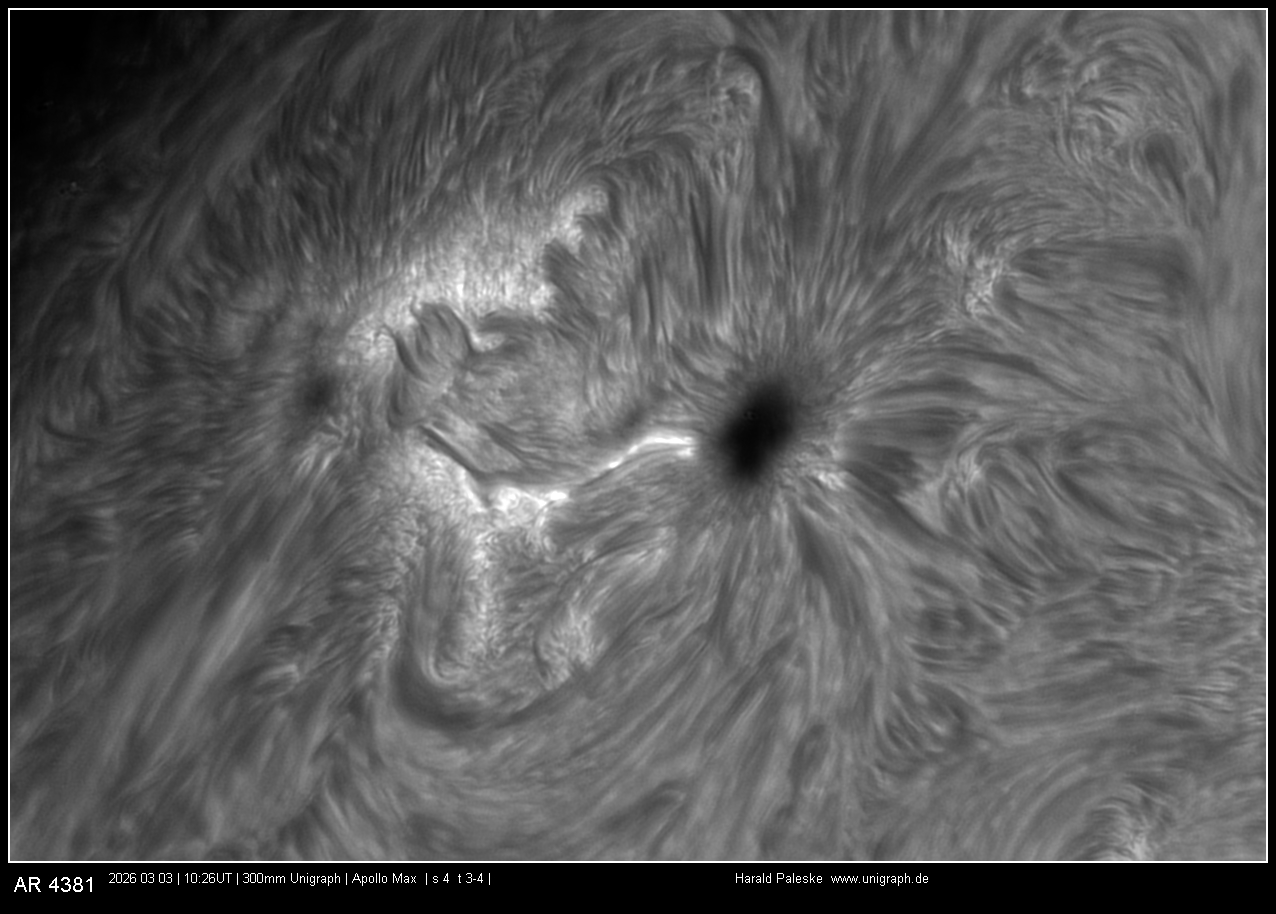 AR 3998 hat sich weiter gut entwickelt. Ein Rückgang der Aktivität konnte aus dem Bildern noch nicht abgeleitet werden. Am Ostrand sind zwei neue Gruppen aufgetaucht.Seeing war für Februarverhältnisse recht ordentlich aber
