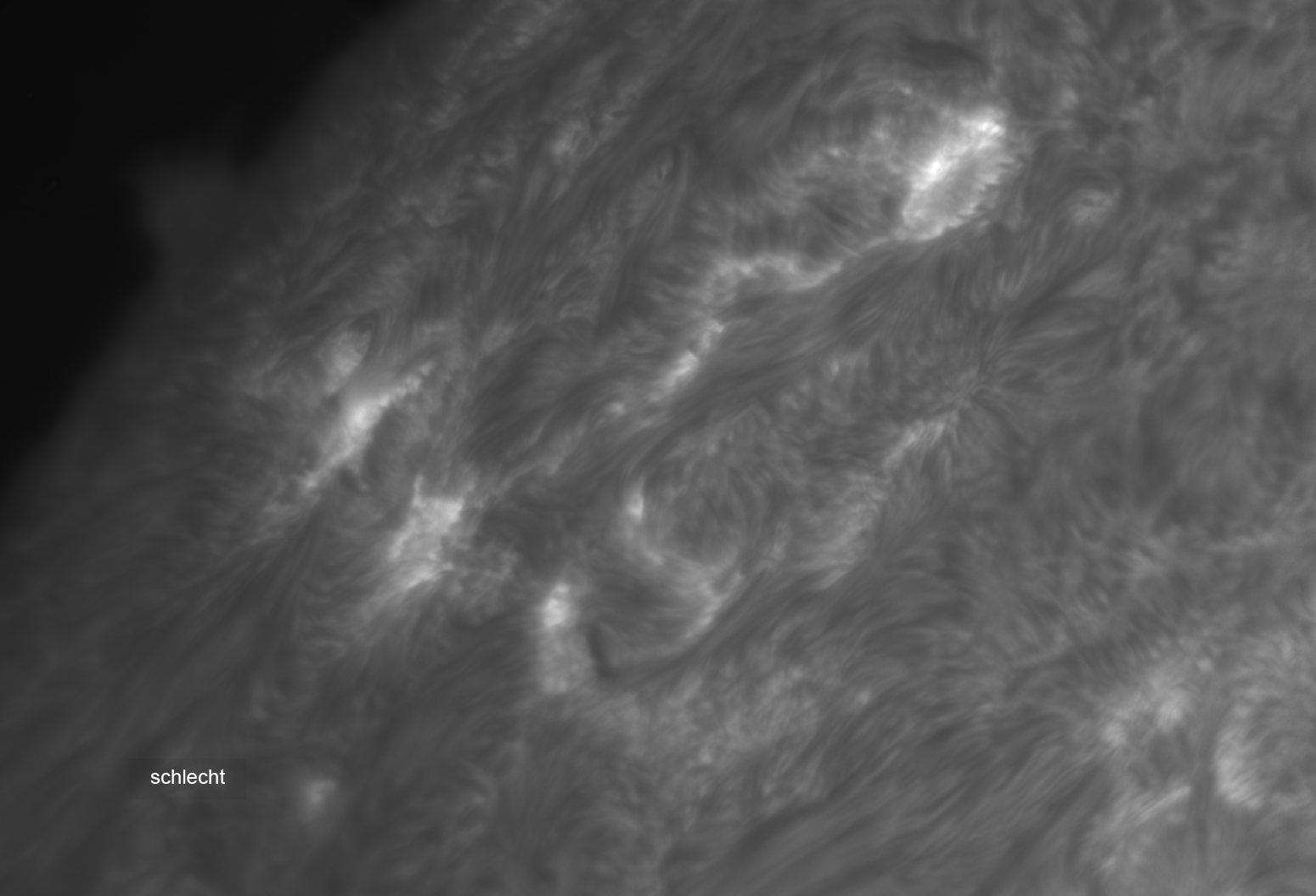 Ohne Rotfilter ging eigentlich gar nichts. Irrigerweise hatte ich nicht den Rotfilter im Strahl sondern versehentlich den Gelbfilter. Ich kämpfte also mit dem Seeing und bildlich "einen Arm im Gips". Im Rotfilter wäre der Kontrast