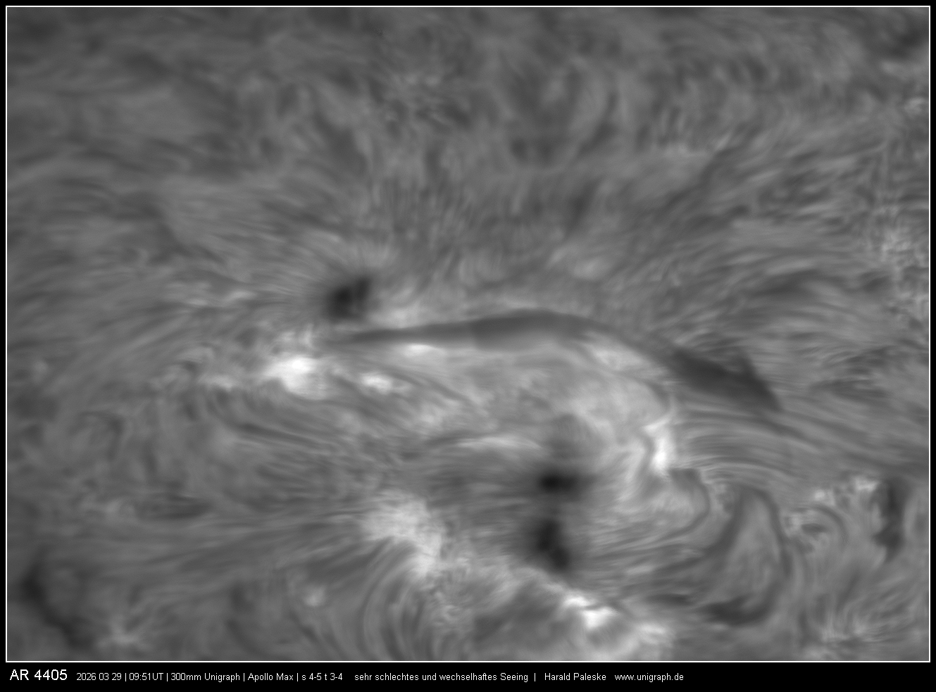 Das Wetter war den ganzen Tag sonnig, das Seeing jedoch grottenschlecht. Vor allem während der Ha Aufnahmen mit voller Öffnung zeigte sich die Empfindlichkeit der 300mm Spiegelöffnung. Deshalb wurde mit nur 250mm Öffnung gearbeitet.