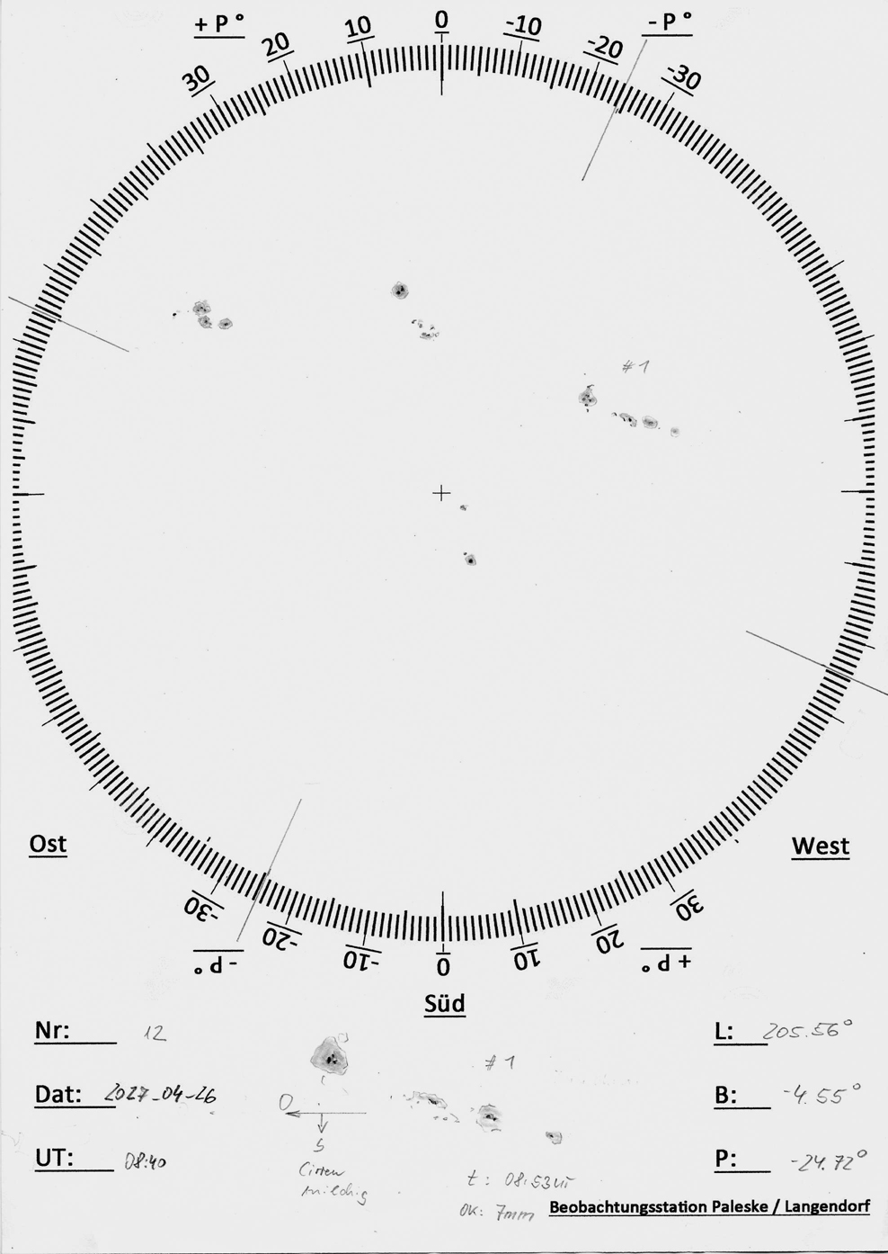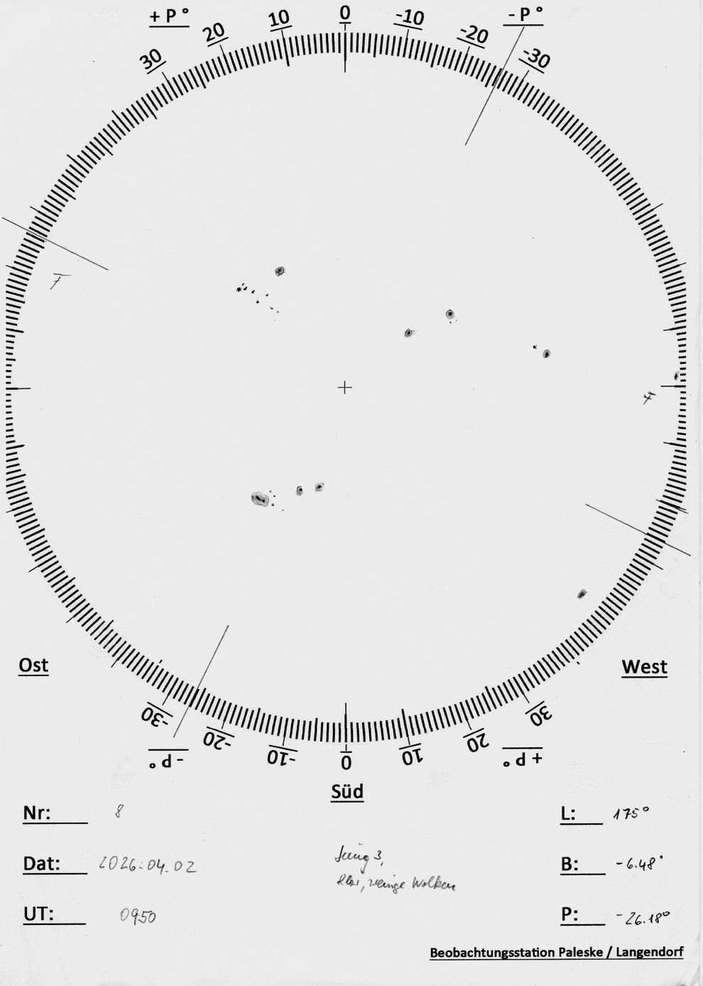 Auf Grund der Bewölkung konnten nicht alle Fleckengruppen eingezeichnet werden. Die kleinen Randgruppen fehlen.
