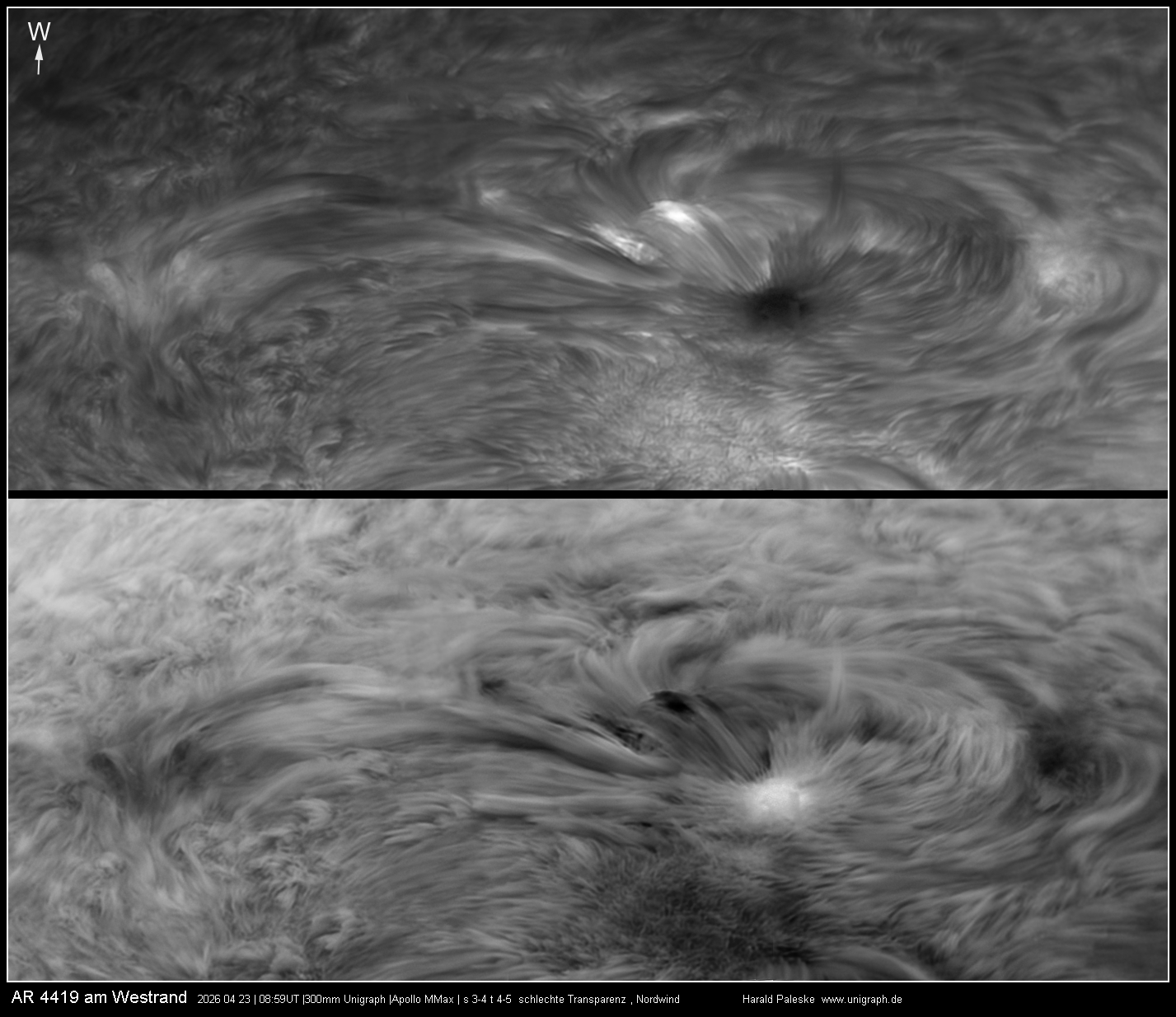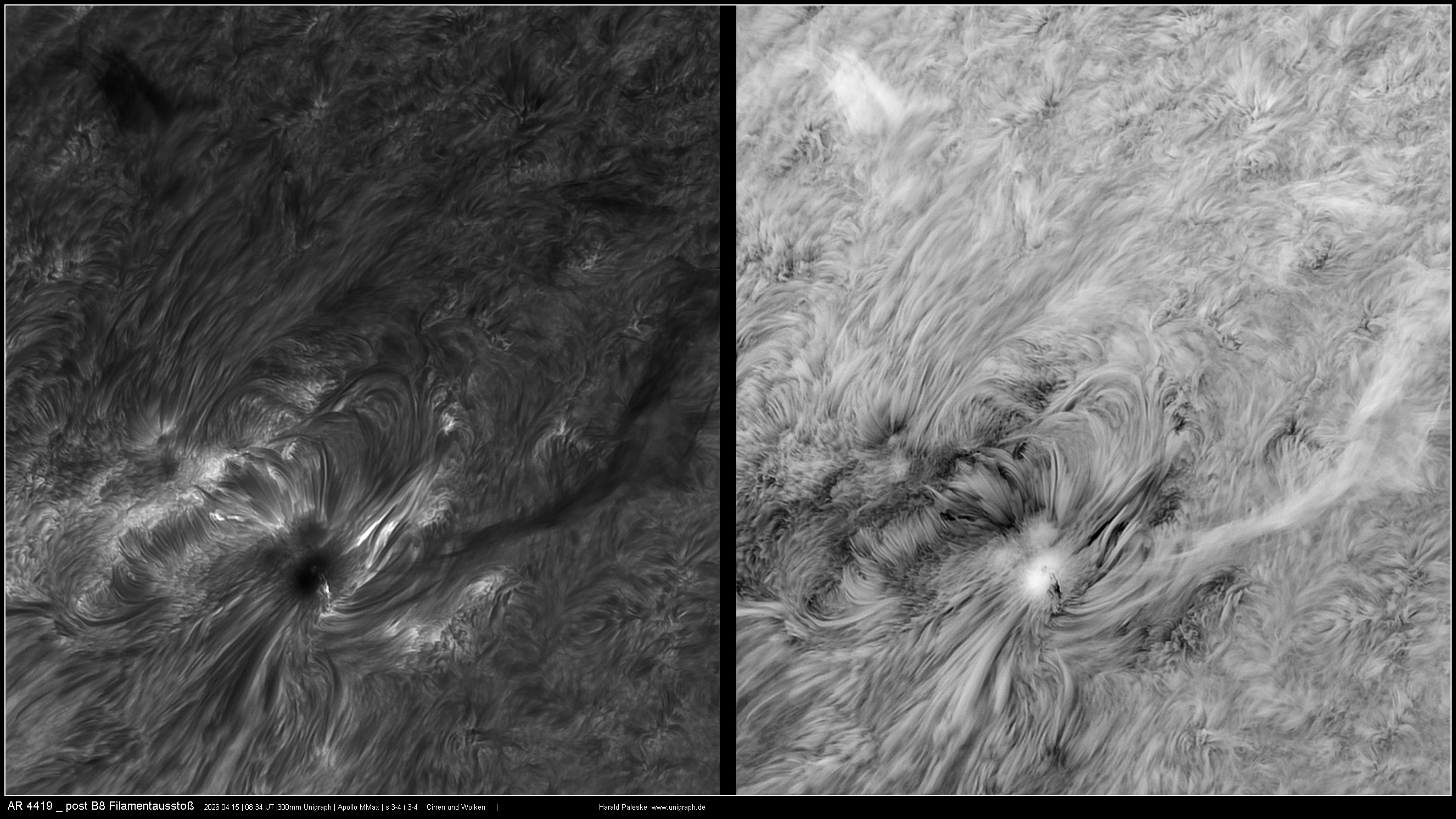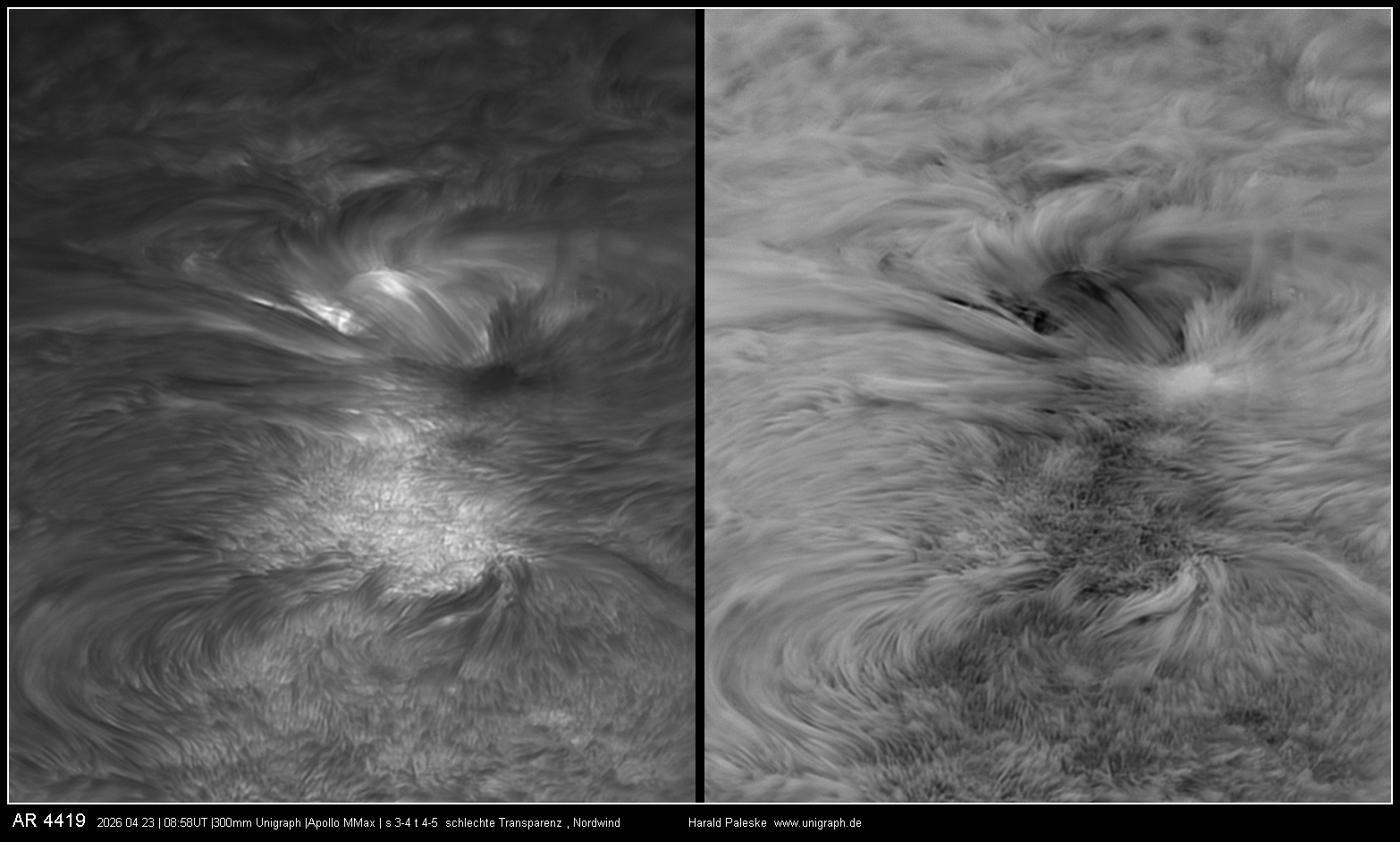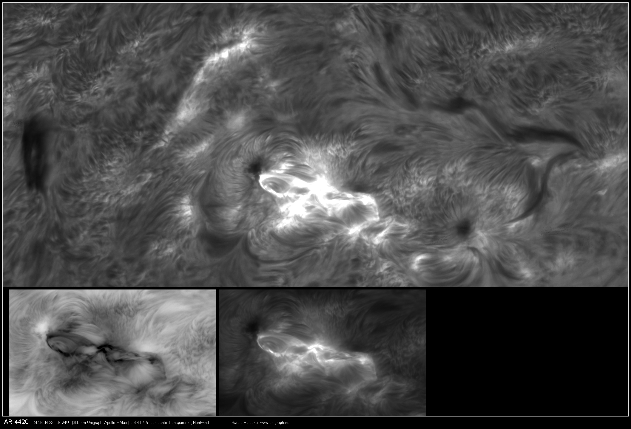 In einer kurzen Phase am Vormittag war das Seeing trotz mäßiger Transparenz auch gut, so dass mit voller Kraft der 300mm Öffnung gearbeitet werden konnte. Im Ergebnis möchte ich besonders das Mosaik der AR 4419 hervorheben. Bearbeitet