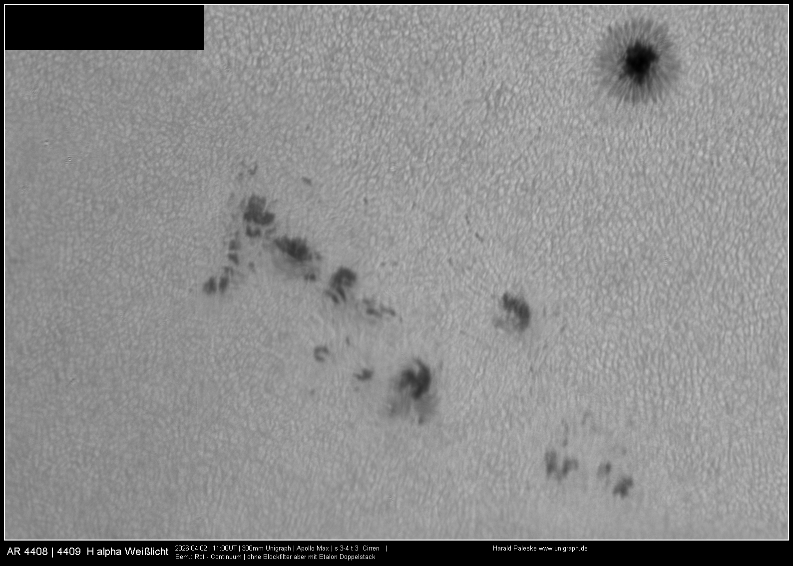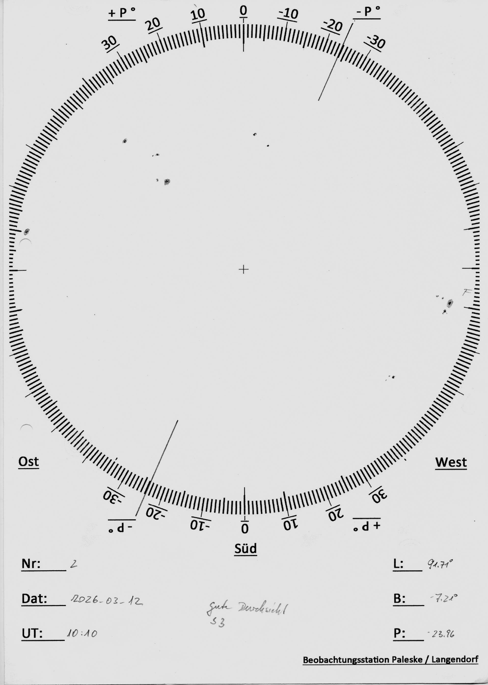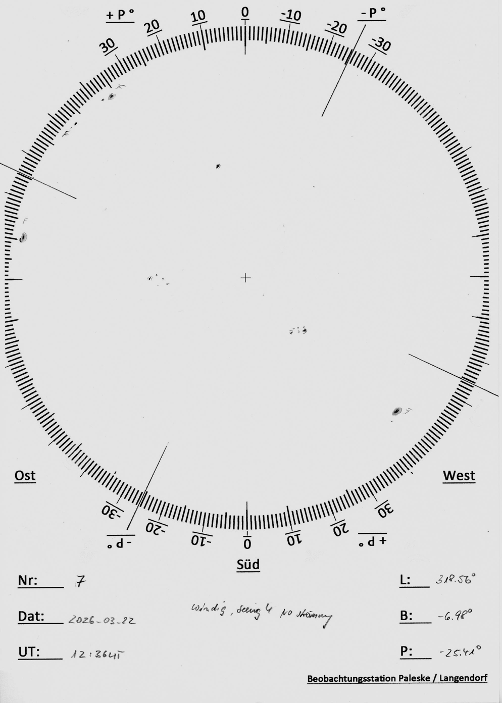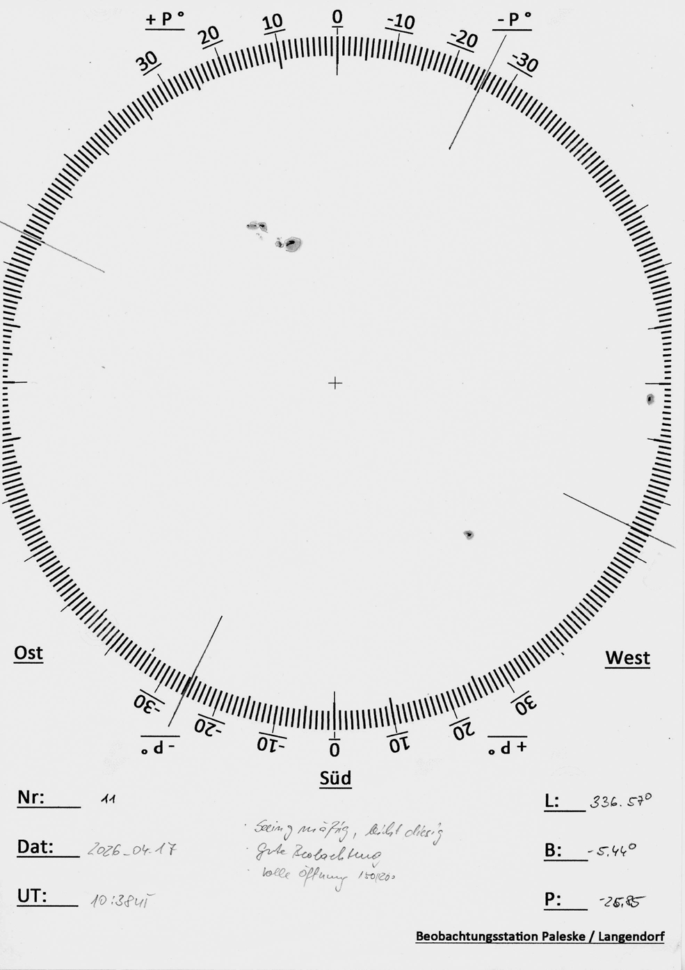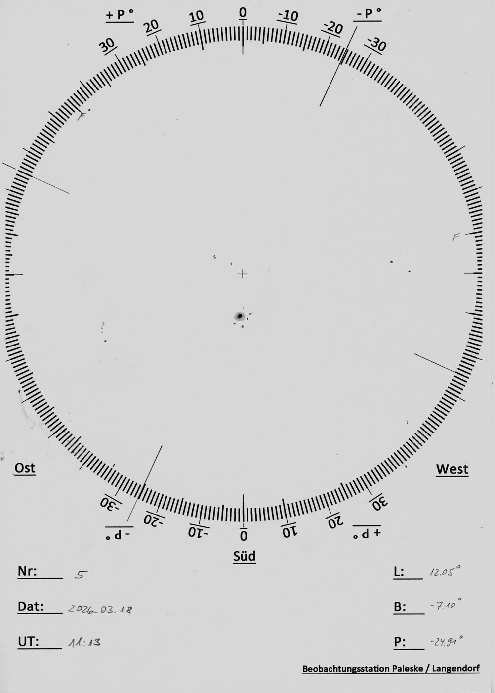 Im Jahr 2025 ergänze ich die Halpha-Beobachtungen durch Daten des 150/1200 FH Refraktors. Dieser projiziert ein rund 17cm großes Sonnenbild auf einen weißen Schirm. Auf diesem befindet sich eine in Ost-Westrichtung angebrachte Zeichenschablone, in welcher mit Bleistift die Umrisse der Sonnenflecken und ihre Positionen auf der Sonnenscheibe eingetragen werden. Daneben werden Detailaufnahmen der Sonnenflecken in WL angefertigt. Das Primärbild wird durch eine 5 fach Barlowlinse auf etwa 75mm also rund 7,5m Brennweite vergrößert. Als Lichtschwächung wird ein Selbstbau Sonnenpentaprisma in Verbindung mit einem Solarcontinuumfilter verwendet. Die Bilder sind in O-W Richtung ausgerichtet. Das Ziel der Aufnahmen ist die Darstellung von zeitlichen Veränderungen in der Morphologie von Fleckengruppen bzw. Detaildarstellungen interessanter Bereiche. Eine physikalische Analyse erfolgt nur im Einzelfall, z.B. beim Wilson Effekt. Daneben werden auch Pseudoweißlichtaufnahmen angefertigt, bei denen auch Halphastrukturen sichtbar sind. Mit 150mm Öffnung und einer guten Optik lassen die allermeisten Strukturen in der Photosphäre der Sonne abbilden. Größere Öffnungen erlauben meist dann nur noch schärfere Bilder.