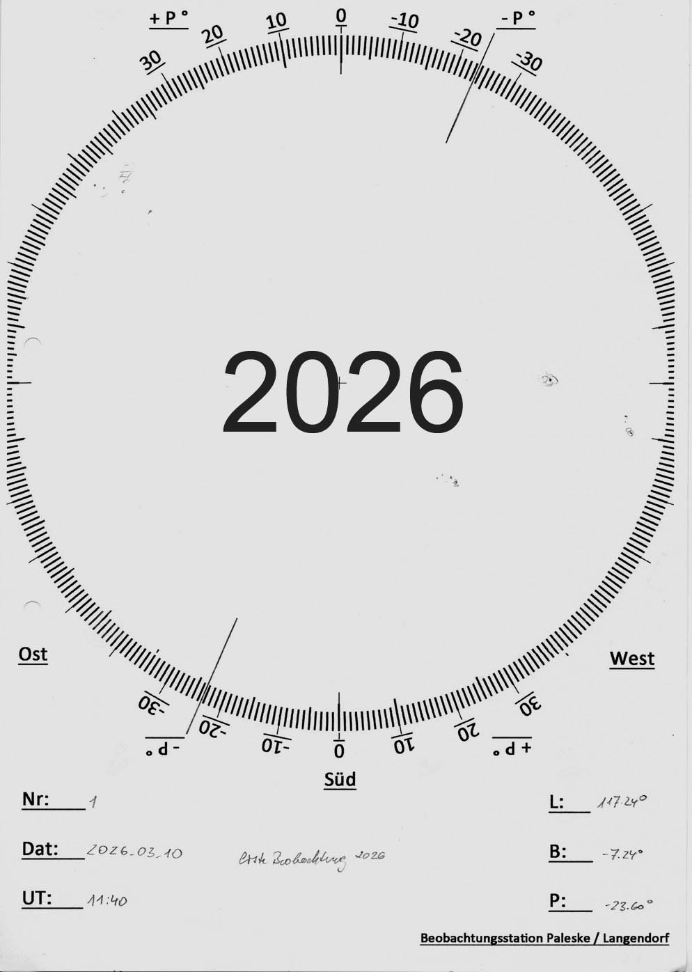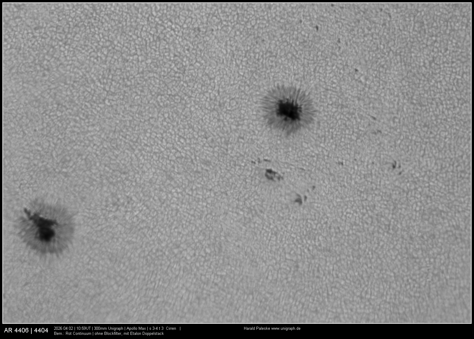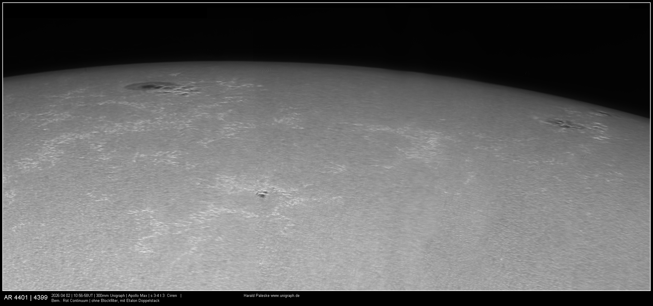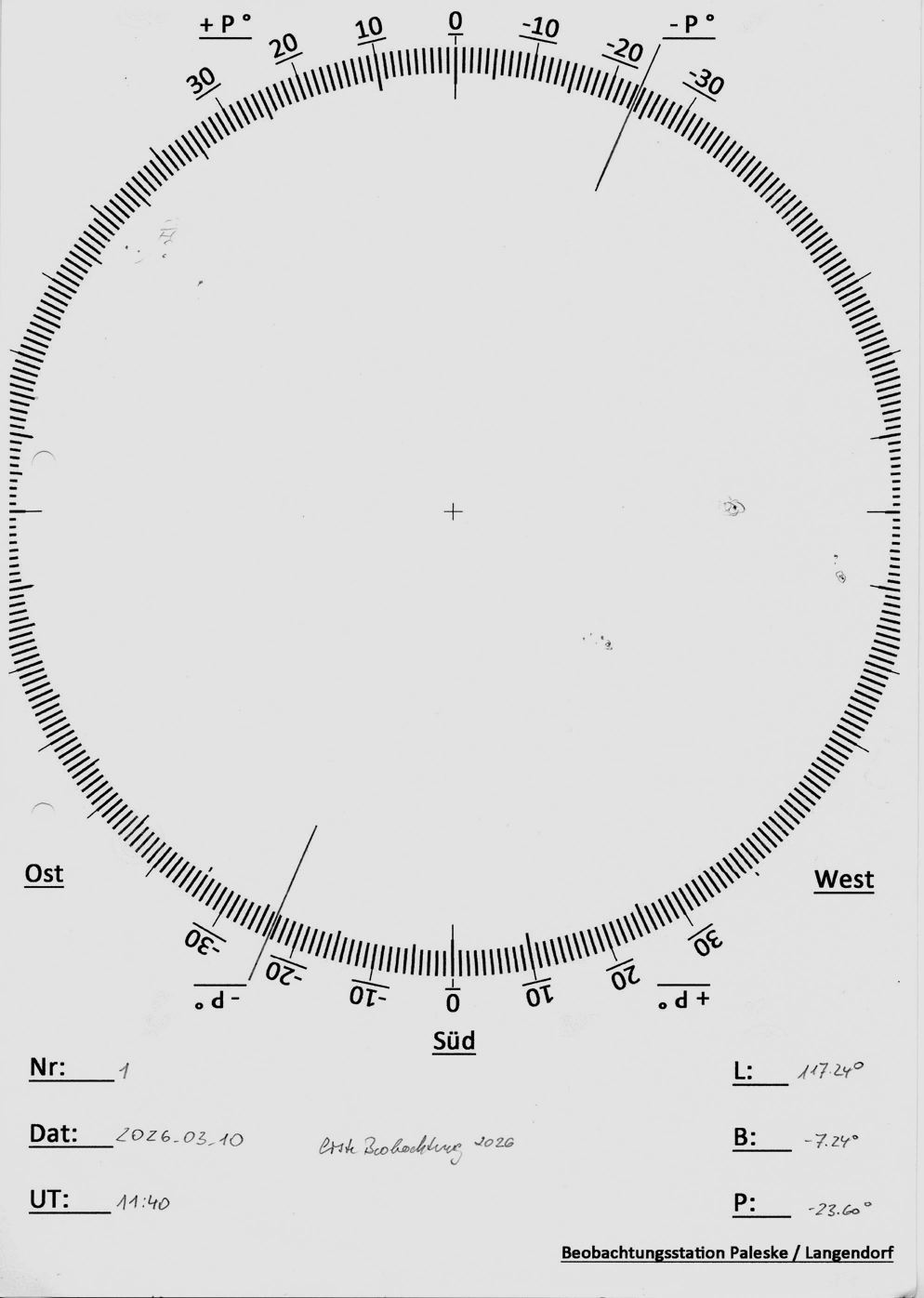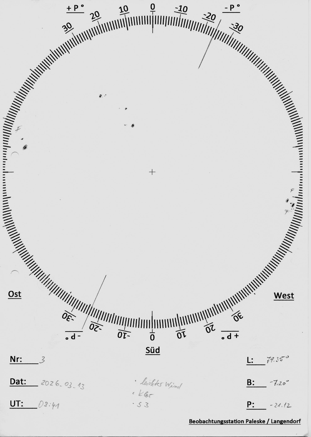 Im Jahr 2025 ergänze ich die Halpha-Beobachtungen durch Daten des 150/1200 FH Refraktors. Dieser projiziert ein rund 17cm großes Sonnenbild auf einen weißen Schirm. Auf diesem befindet sich eine in Ost-Westrichtung angebrachte Zeichenschablone, in welcher mit Bleistift die Umrisse der Sonnenflecken und ihre Positionen auf der Sonnenscheibe eingetragen werden. Daneben werden Detailaufnahmen der Sonnenflecken in WL angefertigt. Das Primärbild wird durch eine 5 fach Barlowlinse auf etwa 75mm also rund 7,5m Brennweite vergrößert. Als Lichtschwächung wird ein Selbstbau Sonnenpentaprisma in Verbindung mit einem Solarcontinuumfilter verwendet. Die Bilder sind in O-W Richtung ausgerichtet. Das Ziel der Aufnahmen ist die Darstellung von zeitlichen Veränderungen in der Morphologie von Fleckengruppen bzw. Detaildarstellungen interessanter Bereiche. Eine physikalische Analyse erfolgt nur im Einzelfall, z.B. beim Wilson Effekt. Daneben werden auch Pseudoweißlichtaufnahmen angefertigt, bei denen auch Halphastrukturen sichtbar sind. Mit 150mm Öffnung und einer guten Optik lassen die allermeisten Strukturen in der Photosphäre der Sonne abbilden. Größere Öffnungen erlauben meist dann nur noch schärfere Bilder.