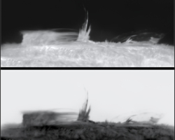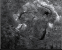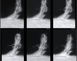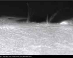 Die Eruption kündigte sich schon 07:50UT an. Am westlichen Sonnenrand war ein kleines aber helles Gebilde sichtbar, welches auch mit kürzester Belichtung im Kern nur weiß zeigte.