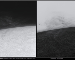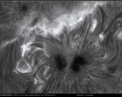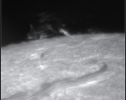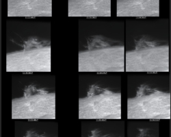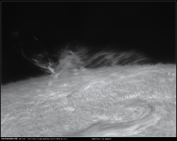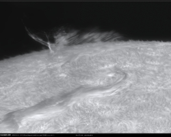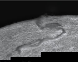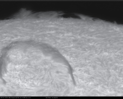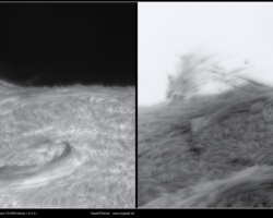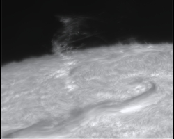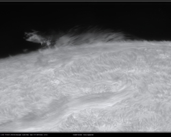 Etwa gegen 11:15UT bemerkte ich, wie sich die Westrandprotuberanz am geschwungengen Filament in schnellen Intervallen aktiver wurde. Die Geschwindigkeiten waren so hoch, dass in Echtzeit Veränderungen auf dem Monitor erkannt werden konnte. Ich lies jetzt alle Experimente sein und konzentrierte mich auf dieses Objekt. Blickweise war das Seeing sehr ruhig, trotzdem stackte ich nur 57 von 1000 frames. Der Gain war bei allen Aufnahmen um die 100. Somit war auch das Rauschen beherrschbar. Bewusst verzichtete ich auf eine härtere Bearbeitung des Materials. Einfache unscharfe Masken in Photoshop reichte vollkommen aus, die Bilddetails gut darzustellen.   Die Animationen sollen zeigen, wie sich der Anblick der Chromosphäre verändert, wenn man durch die Linie shiftet. So gut wie die Bilder der Profis (Big Bear) sind allerdings diese Aufnahmen nicht. Die erste Animation war nicht geplant, daher springt der Rand des Bildes hin und her. Trotzdem kann man grob die wesentlichen Strukturänderungen gut erkennen.