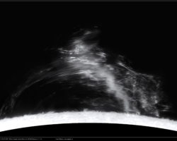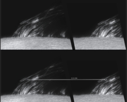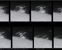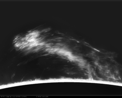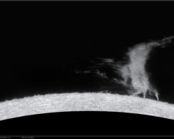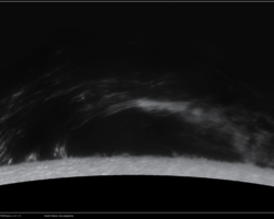 wurde das gesamte Halpha Programm durchgezogen, Hauptsache die Protuberanz war erstmal im „Kasten“. Sie entwickelte sich sehr schnell zu einem wunderschönen Bogen. Mächtige Halphawolken strömten entlang der Magnetfeldlinien